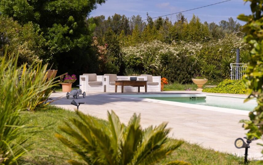 - L’espace piscine : Un bassin de 10 x 4 m trône au cœur du jardin, offrant un véritable espace de bien-être face au panorama.