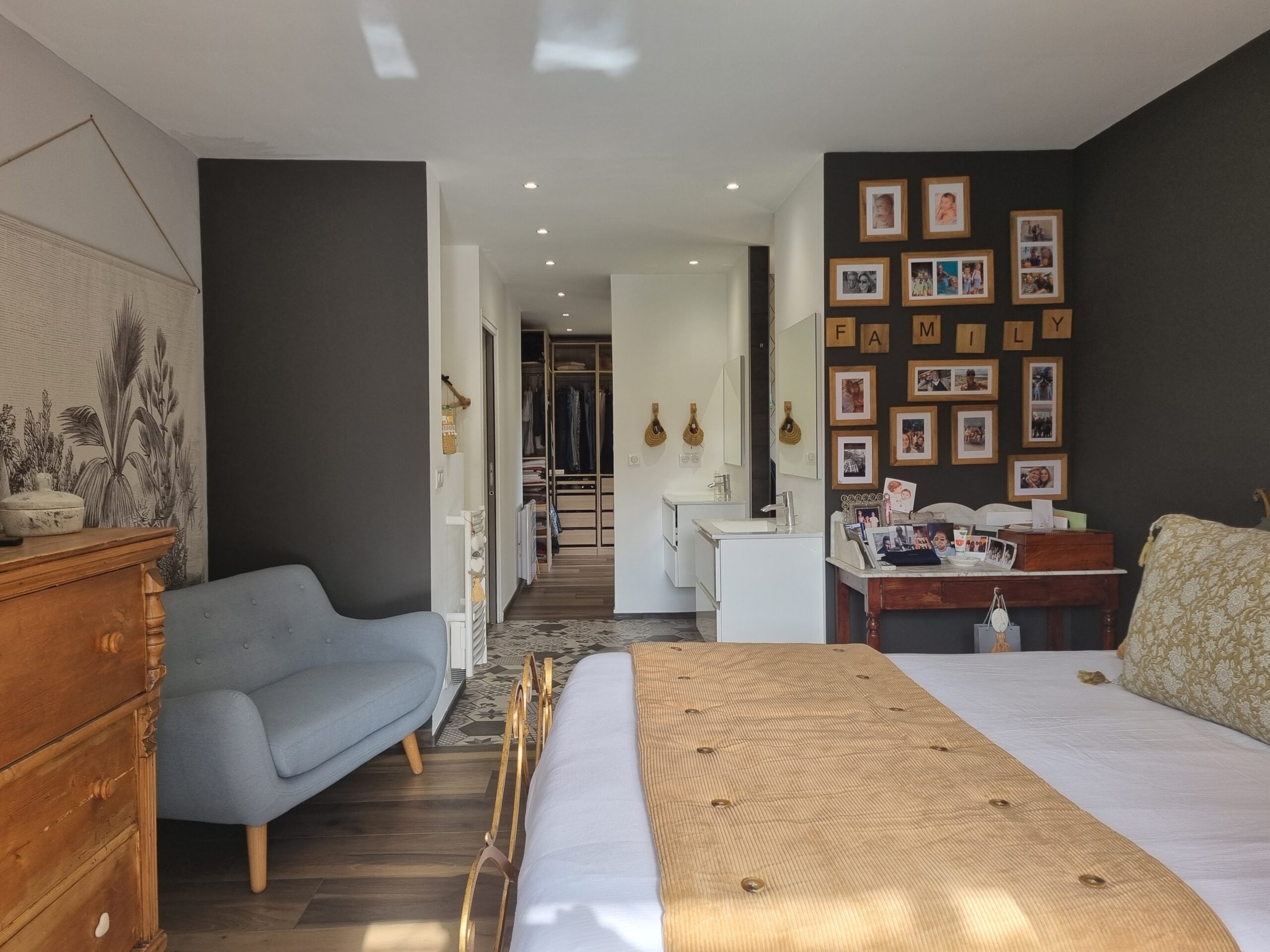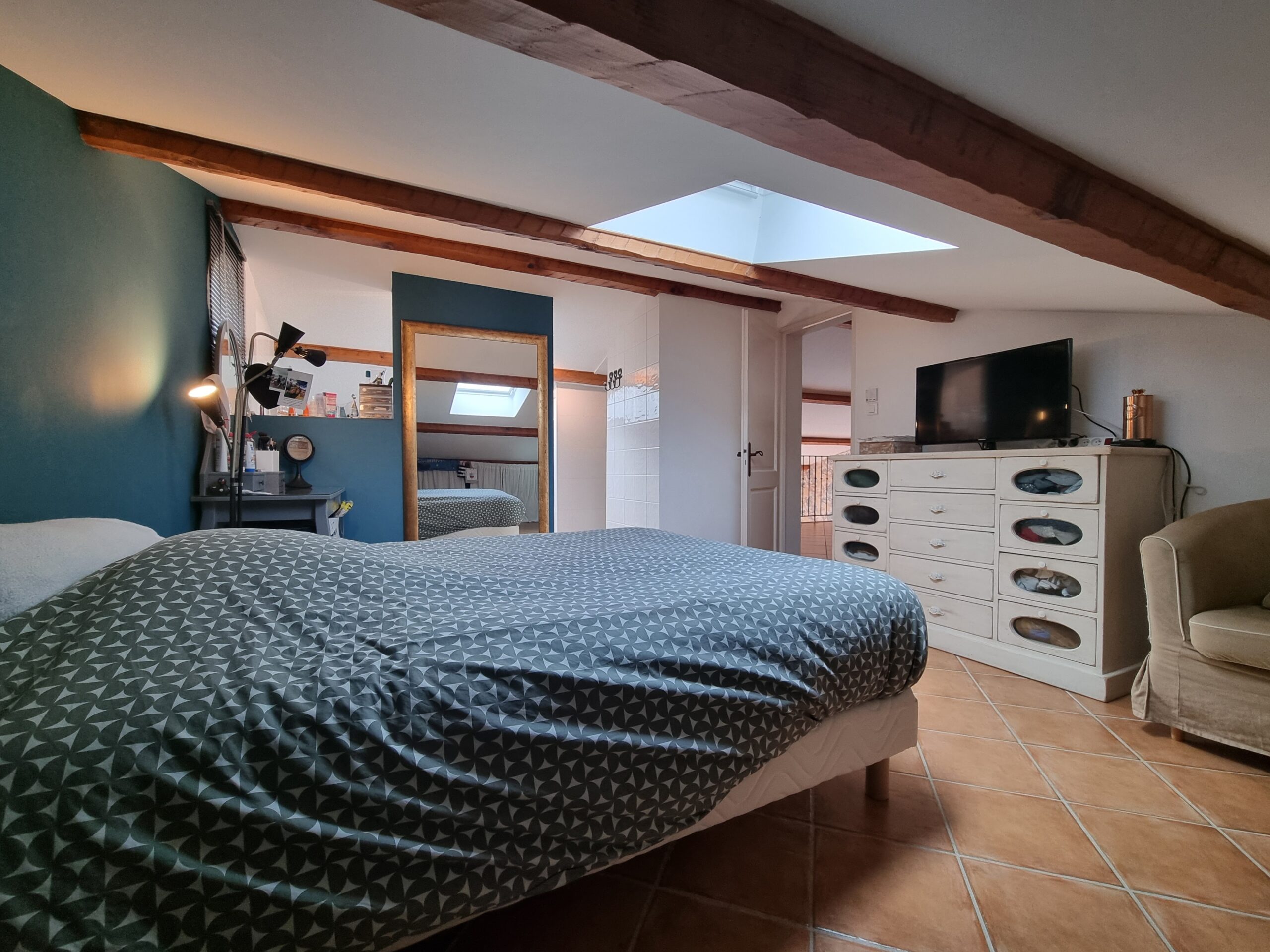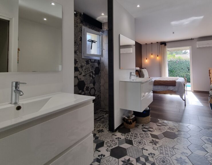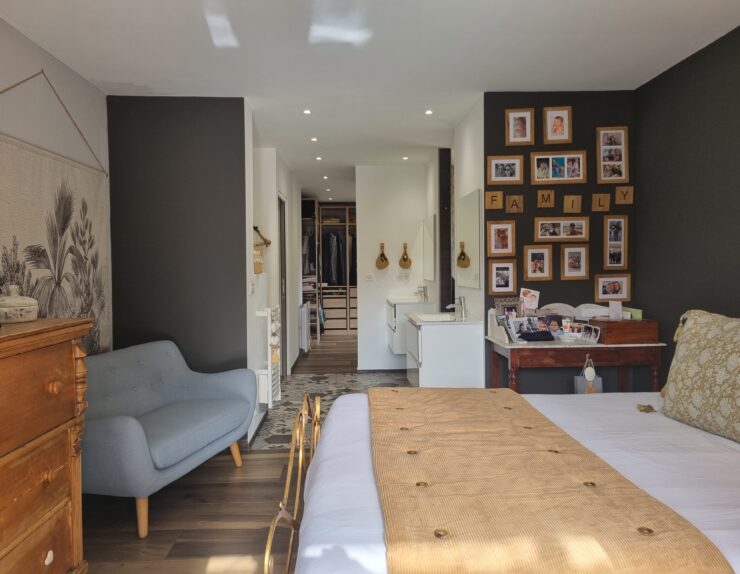 - L’étage : Ce niveau dispose d’une mezzanine aménagée et d’une troisième suite parentale, garantissant une indépendance totale.
