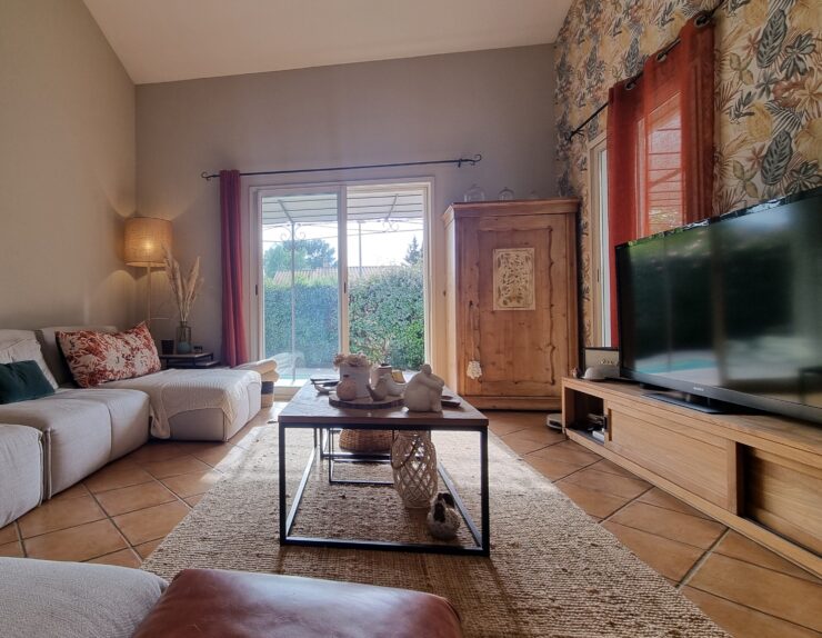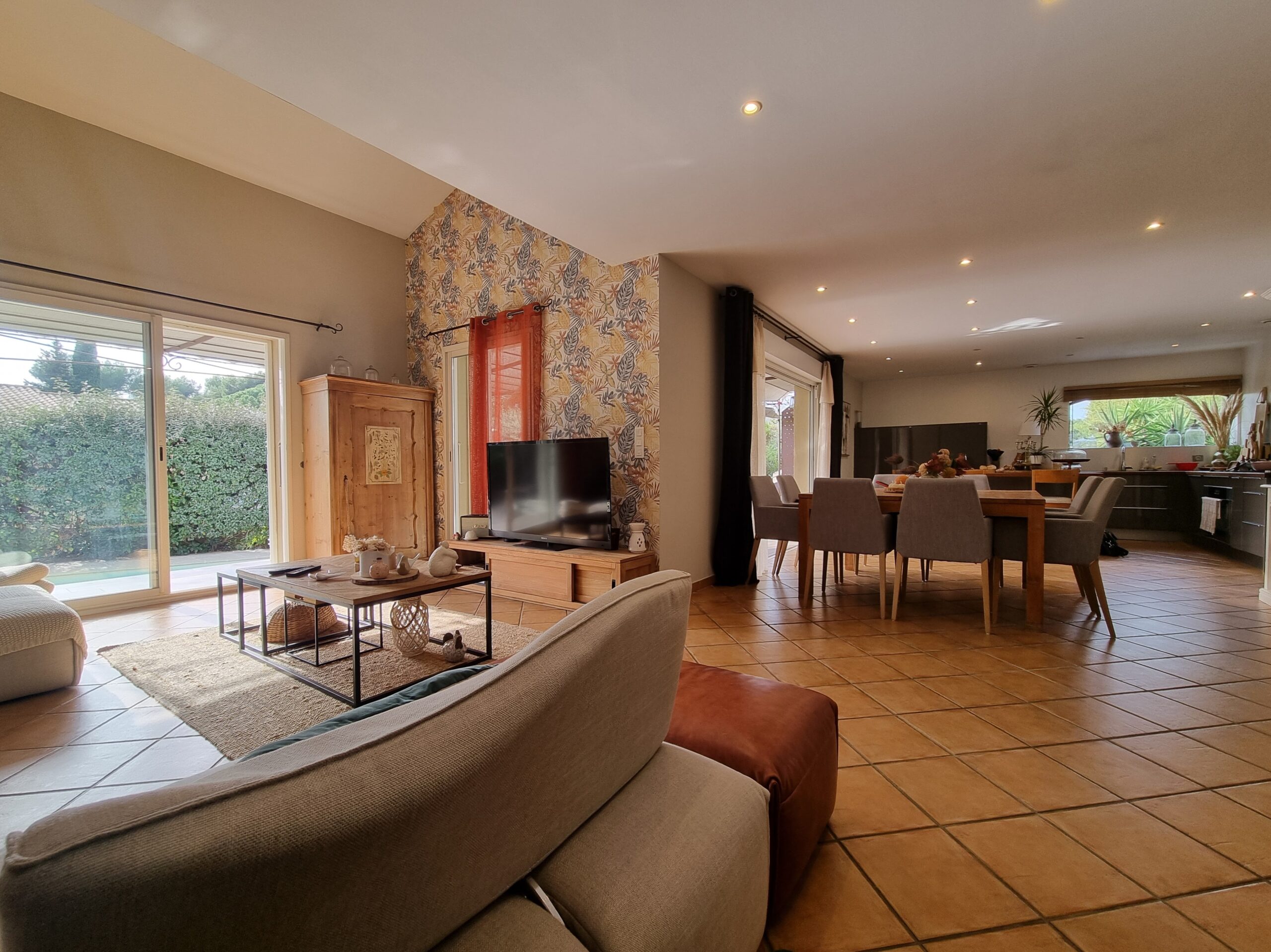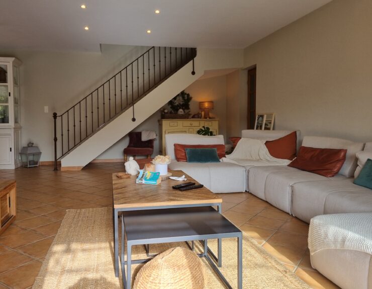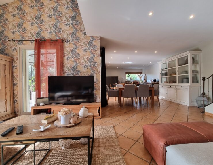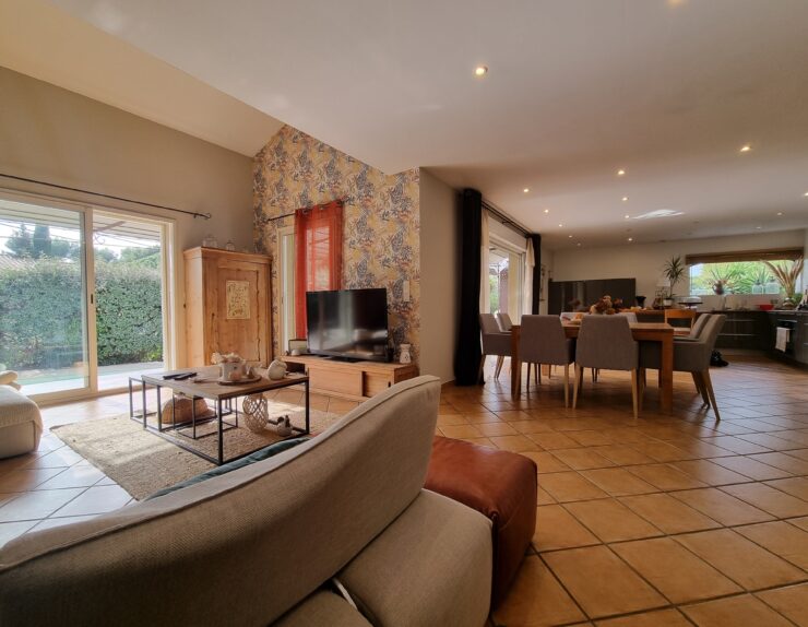 - L’espace de vie : On profite d’un vaste séjour-cuisine US de 60 m2, baigné de lumière, s’ouvrant largement sur la pergola et l’espace piscine pour une vie dedans-dehors fluide.