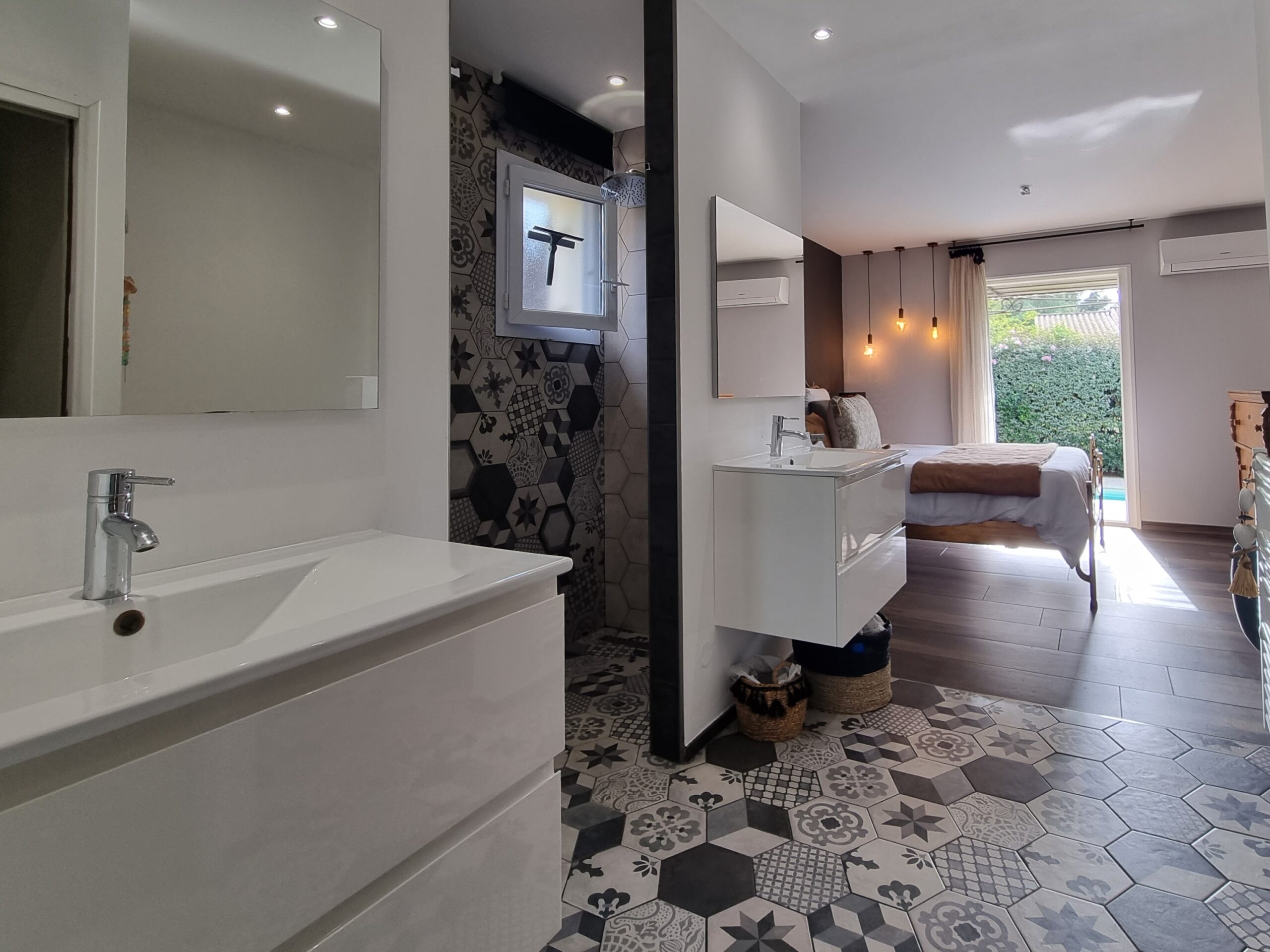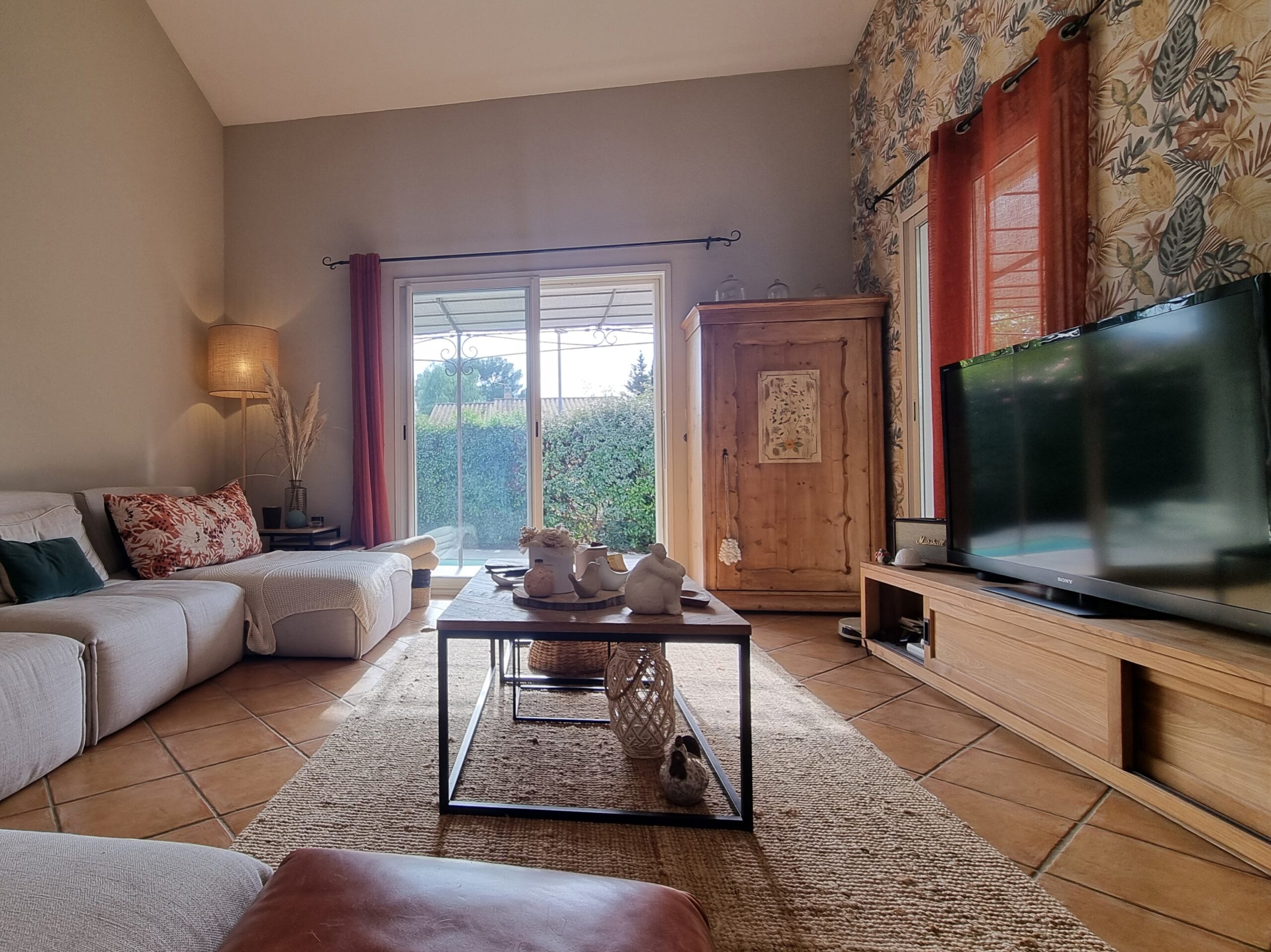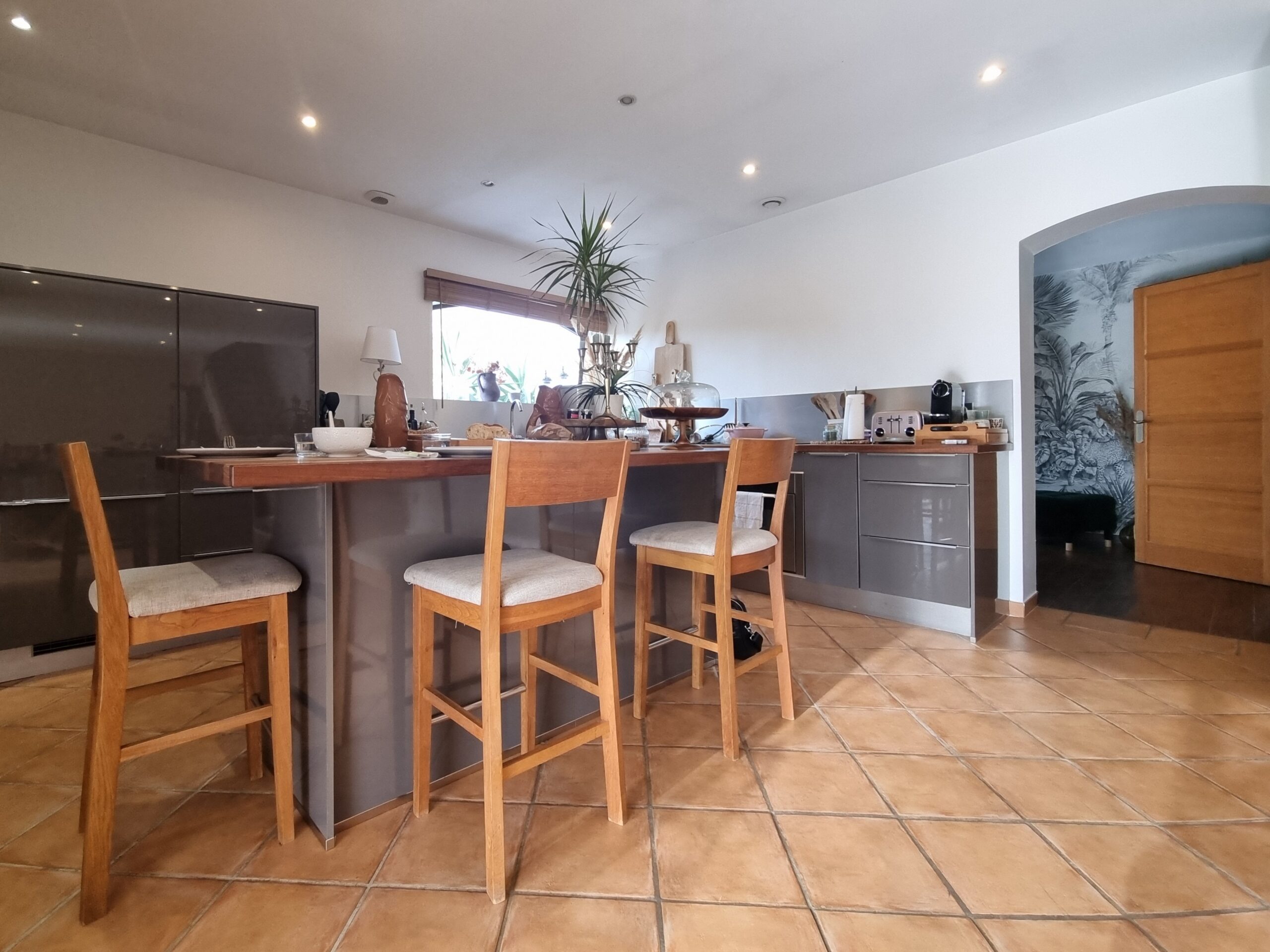 - L’espace de vie : On profite d’un vaste séjour-cuisine US de 60 m2, baigné de lumière, s’ouvrant largement sur la pergola et l’espace piscine pour une vie dedans-dehors fluide.